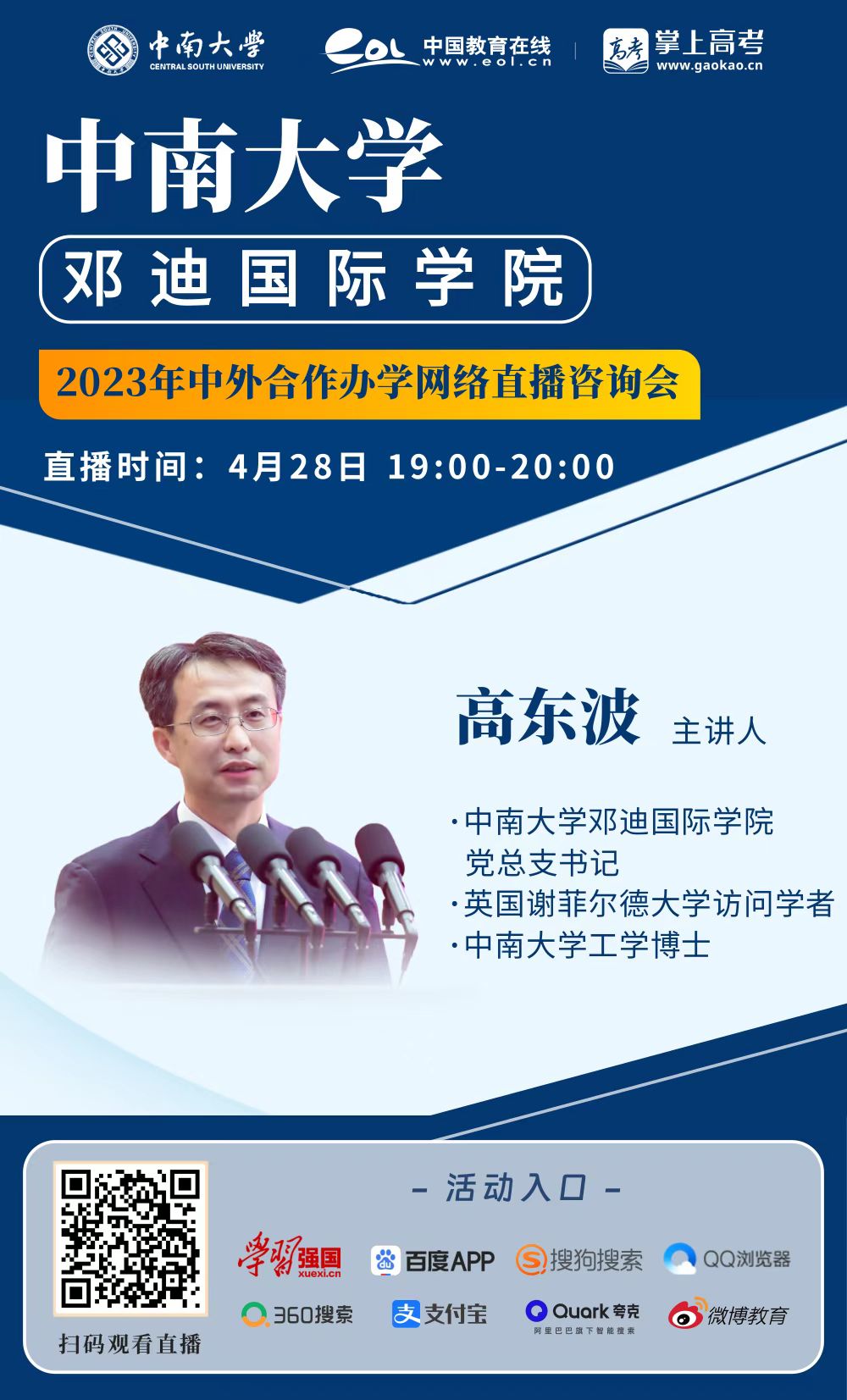 为帮助各位考生和家长更加全面地了解体育博彩网站-体育博彩公司 ,体育博彩网站 将于4月28日19:00-20:00举办2023年度首场招生宣讲会,学院党总支书记高东波将与大家相约云端,详细解读学院概况、项目特色、人才培养、校园生活等内容,并为各位考生及家长解疑答惑。